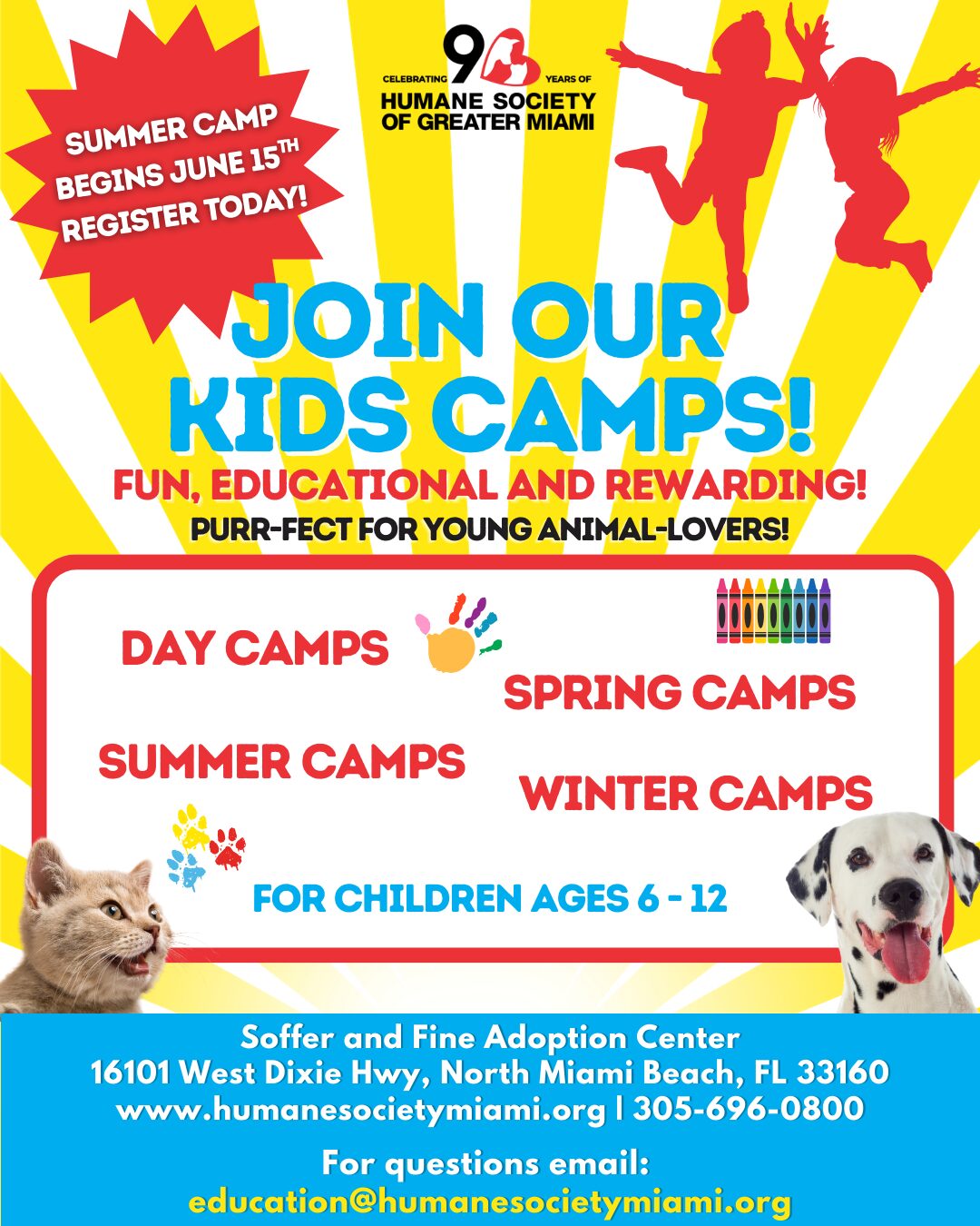 Get ready for a “paws”-itively fun summer! Starting June 15, our Kids Camp (ages 6–12) is packed with shelter tours, crafts, treat-making, and cuddles with adorable pets. Spots are limited! Book now for a week of fun, learning, and furry friends at http://www.humanesocietymiami.org/humane-education